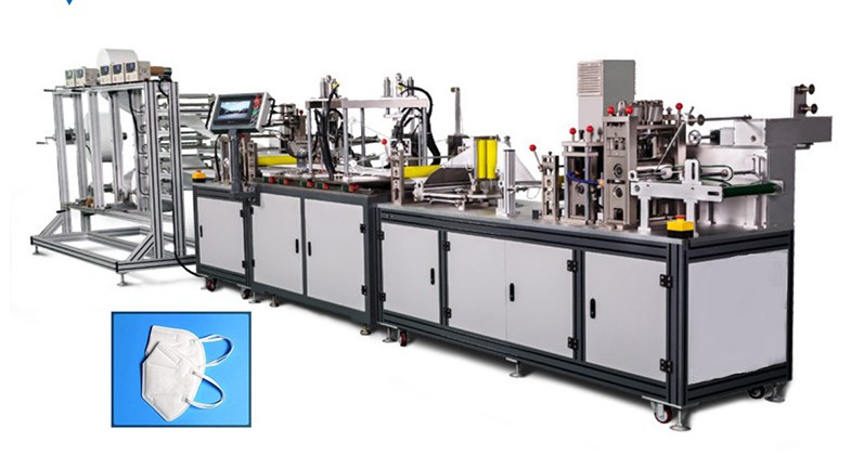 全自動外耳帶口罩熔接機采用超聲波熔接方式將耳帶(松緊帶)熔合于口罩本體片外側,形成一個完整的口罩的設備。是耳帶口罩生產的最后一個工序,設備采用輸送鏈條方式將口罩本體一片一片的放置于治具內,全程自動化操作。